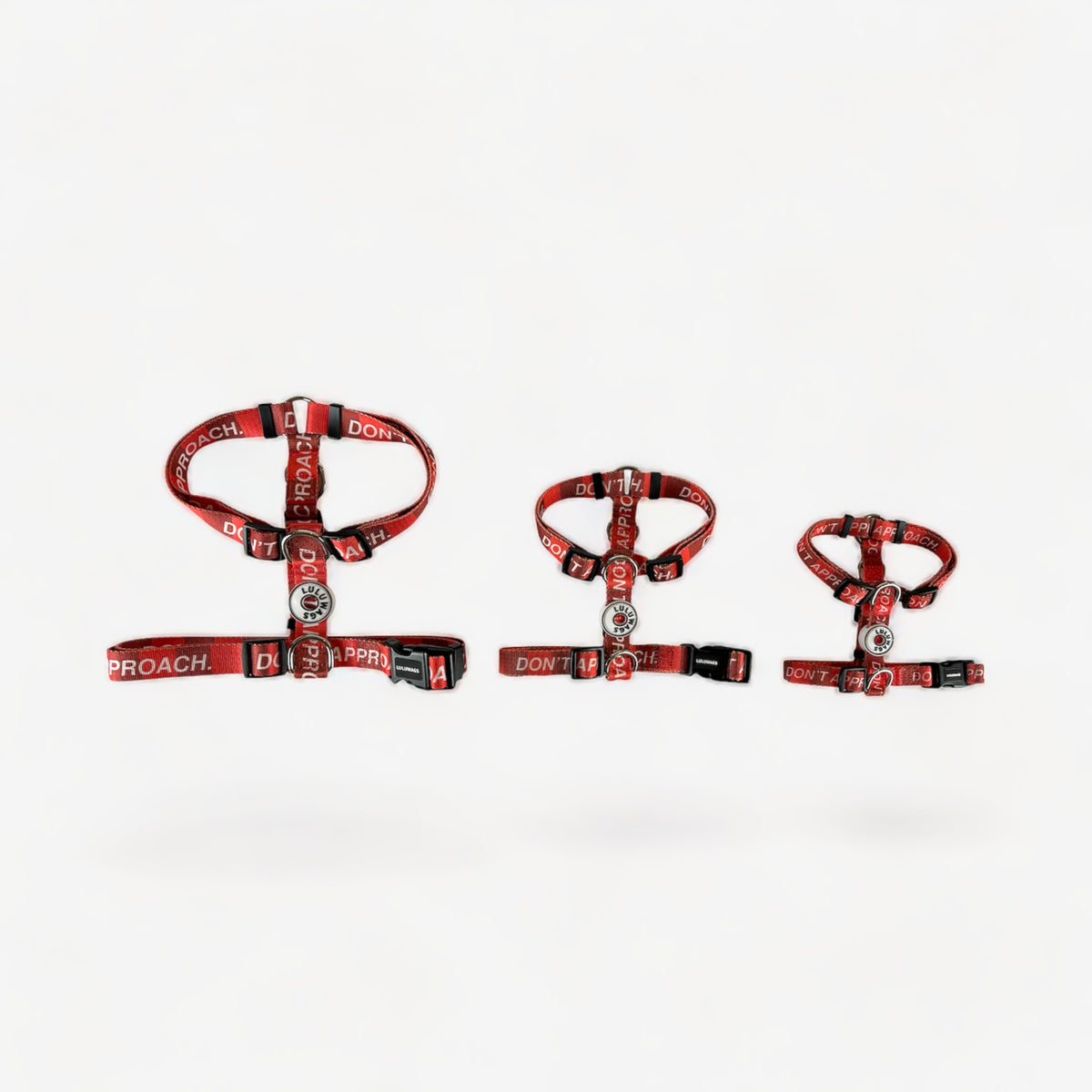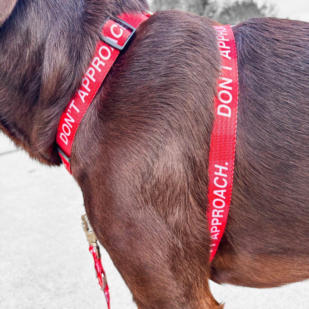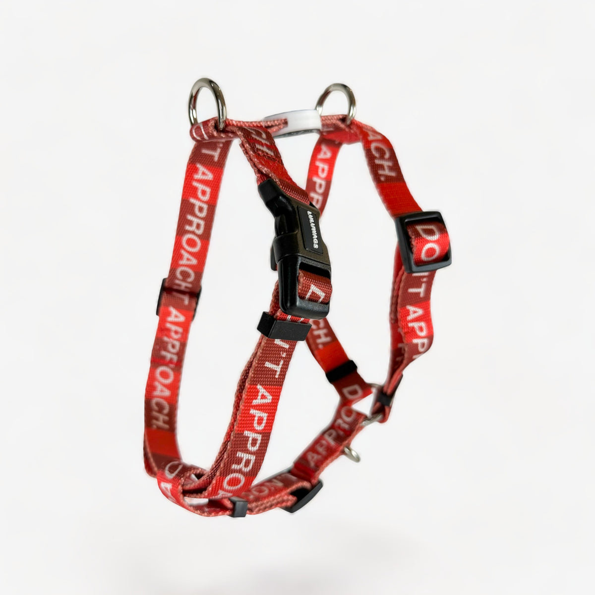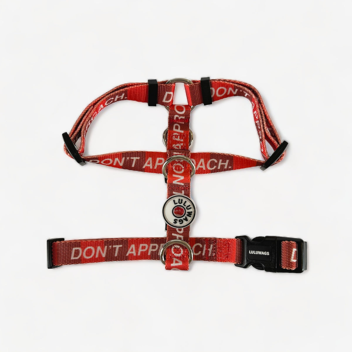 Stand out while setting boundaries with our vibrant red 'Don't Approach Me' adjustable harness, featuring bold white text. This eye-catching harness not only enhances your pet's safety but also sends a clear message to maintain a respectful distance. Prioritize your dog's well-being and ensure a stress-free experience with this essential, attention-grabbing harness designed to keep your canine companion protected and at ease in public spaces.