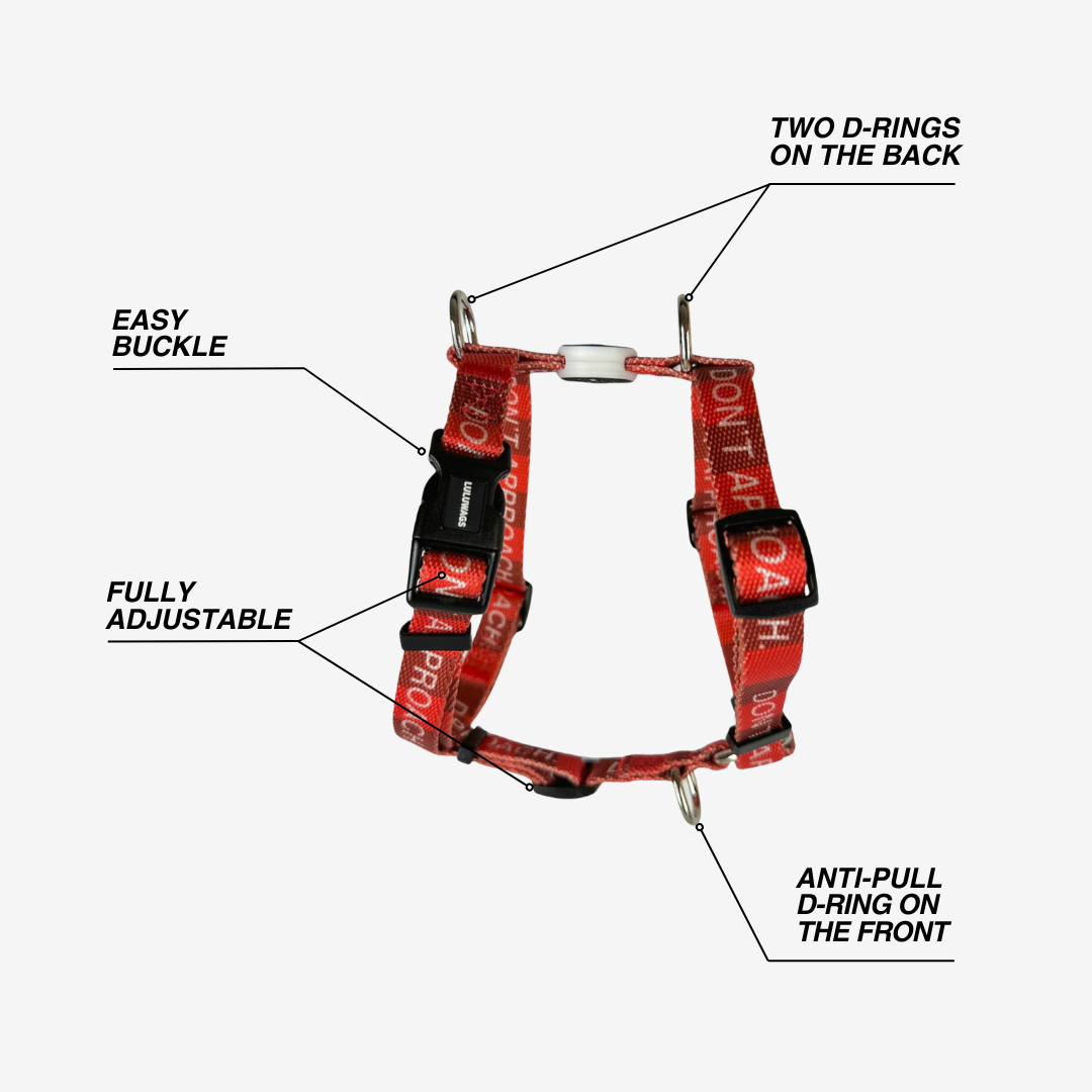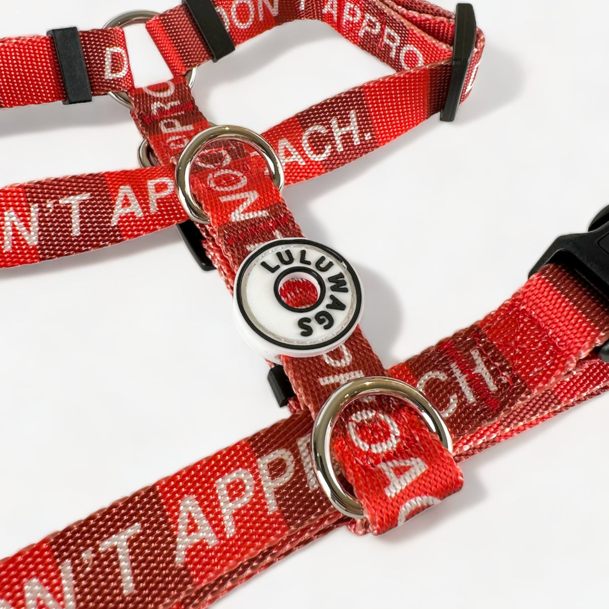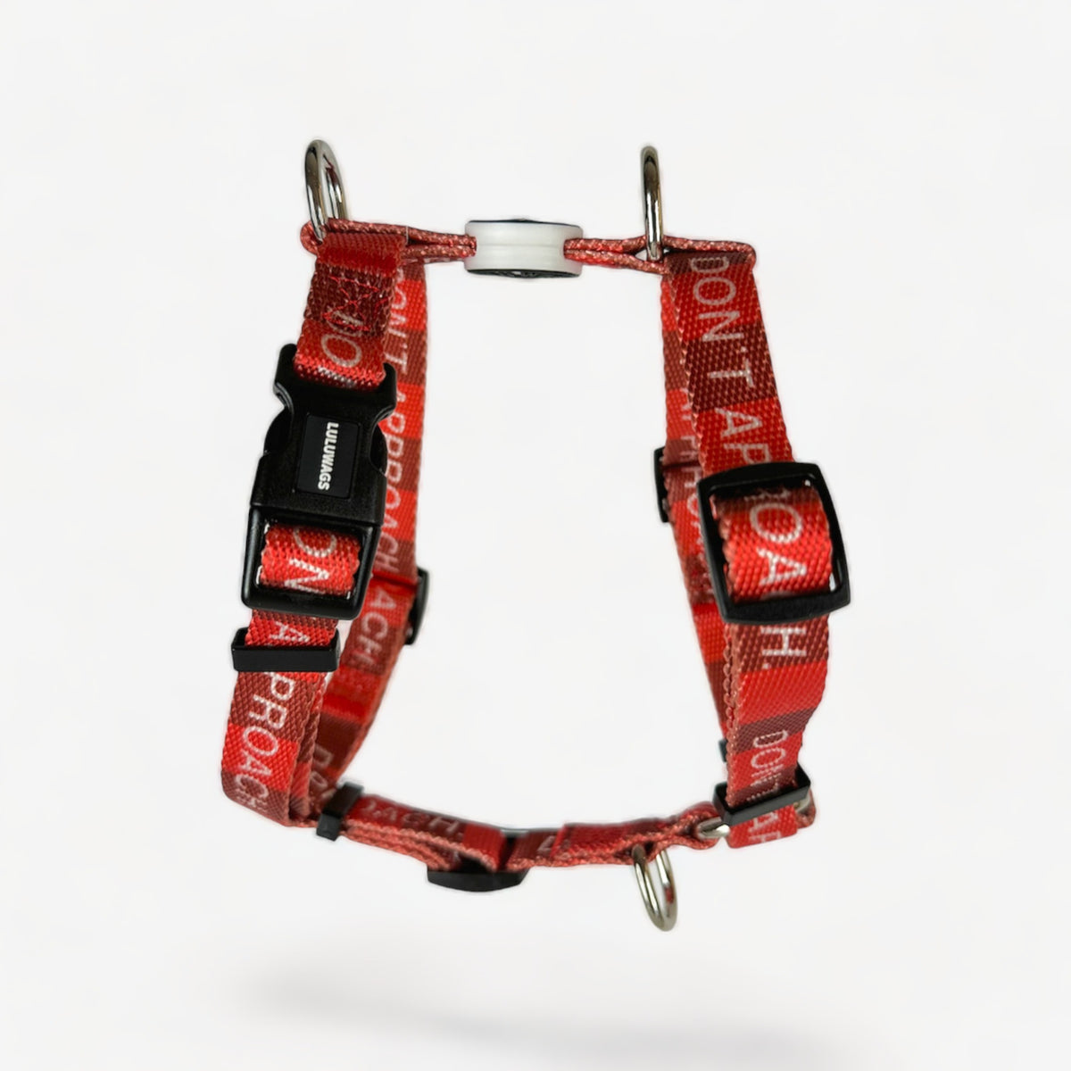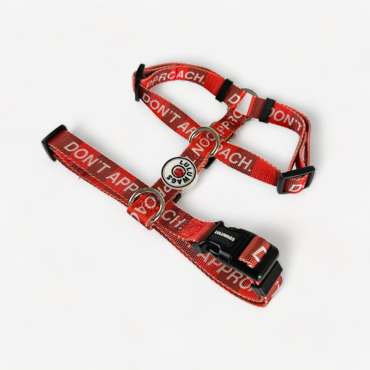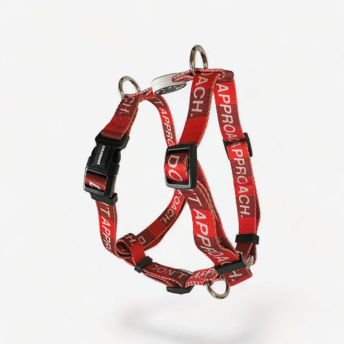 Stand out while setting boundaries with our vibrant red 'Don't Approach Me' adjustable harness, featuring bold white text. This eye-catching harness not only enhances your pet's safety but also sends a clear message to maintain a respectful distance. Prioritize your dog's well-being and ensure a stress-free experience with this essential, attention-grabbing harness designed to keep your canine companion protected and at ease in public spaces.