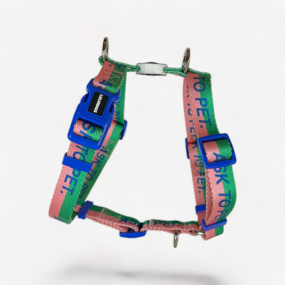 Encourage positive interactions with our 'Ask to Pet' dog harness. This thoughtfully designed harness gently reminds others that while your dog may appear intimidating, they're friendly and approachable. By using this harness, you're promoting considerate behavior and encouraging people to ask for permission before petting your furry friend. Equip your well-mannered companion with this essential harness, fostering respectful and enjoyable encounters for all!